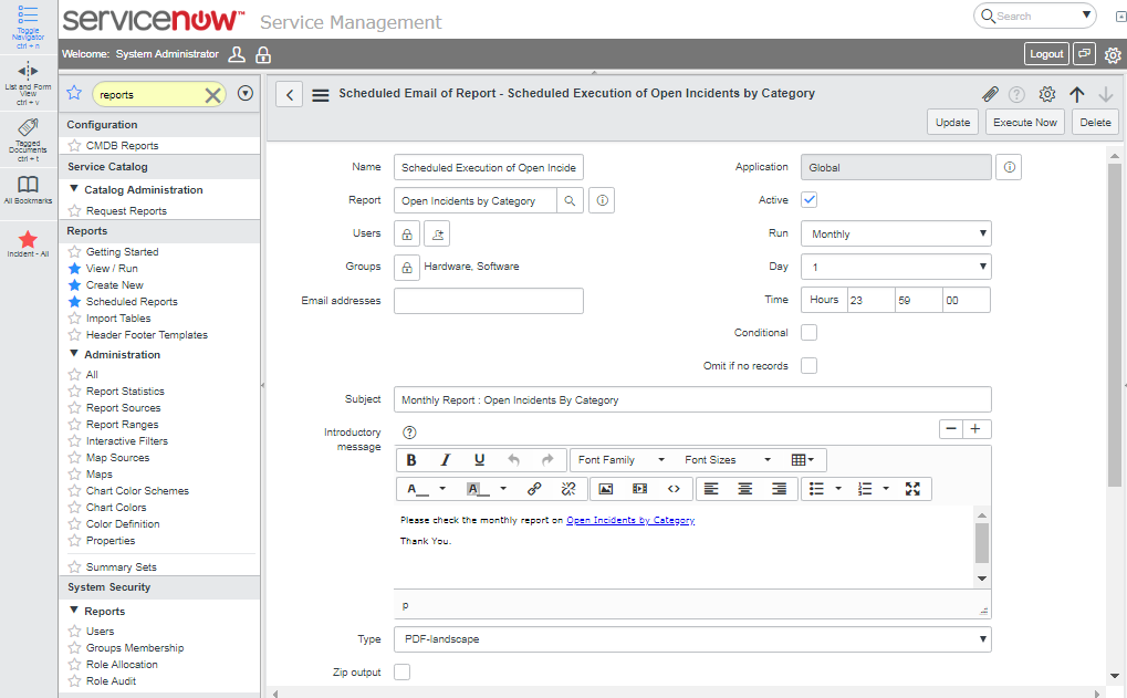 Example: Automating distribution by Scheduling the ‘Open Incidents by Category’ report.