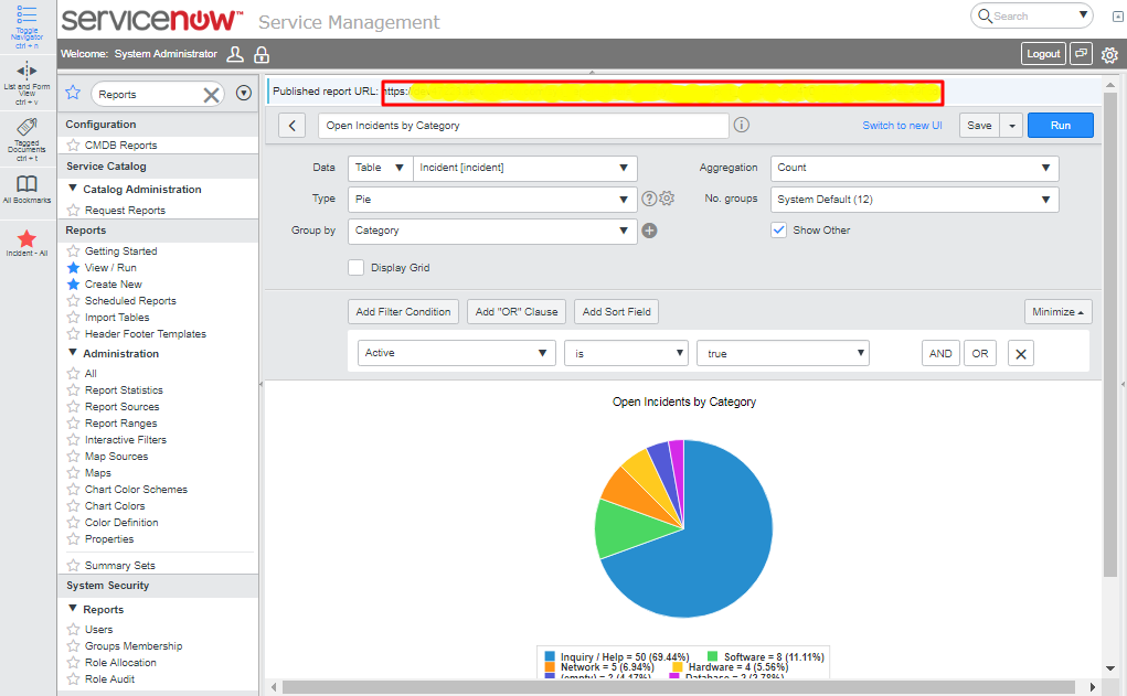 The important point to remember here is the limits to the amount of data that can be exported at one time. The ServiceNow platform has provided default limits to the amount of data that can be exported at a time. Different formats have different export limits.A good practice for sharing a ServiceNow report is to publish it to a publicly accessible URL and schedule distribution of the URL by email for delivery at specific times of the day, week or month, internally or externally.To publish reports, the logged in user must have both the ITIL and report_publisher role.Let’s say one wants to publish the ‘Open Incidents by Category’ report to share it.Open the report and click on triangle icon next to the ‘Save’ button and select the ‘Publish’ option as shown below: