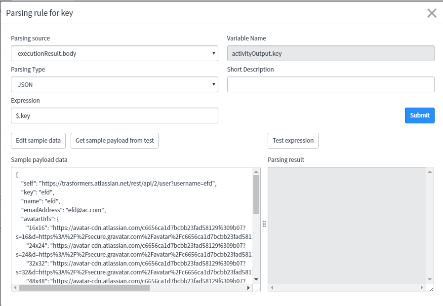 - Expression: Select any of the variables in sample data payload e.g ‘Key’. Automatically, its expression gets created in expression tab.