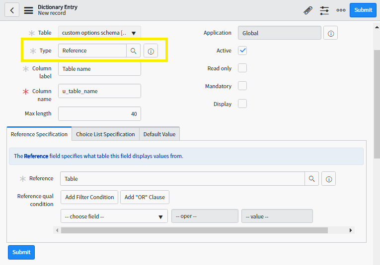 Other ServiceNow Fields are not available or supported in option schema. But for that one can create a table extending from ‘sp_instance’ which will store the widget instance options. It allows one to define complex option schema, where they can have any ServiceNow field type along with advanced customizations such as client script, UI policy, add filters to the fields etc. to the option schema.